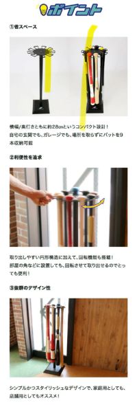 自宅の玄関でも、ガレージでも、場所を取らずにバットを9本収納可能