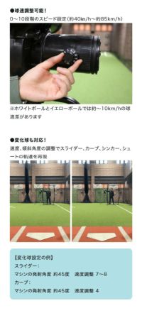 速度、傾斜角度の調整でスライダー、カーブ、シンカー、シュートの軌道を再現
