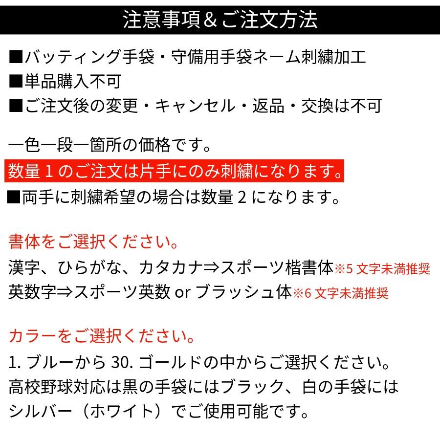 他の画像を見る 手袋同時購入のみ注文可能 バッティング手袋 刺繍 高校生は使用可能手袋に本体同色糸刺繍公式戦使用可 バッティンググローブ ネーム刺繍 刺しゅう プレゼント 一箇所一段一色 当店販売価格 ¥ 600 税込 詳細を見る お気に入りに登録する